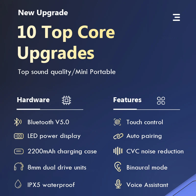 Feature1, Bluetooth V5.0, support most of bluetooth devices and lower power consumption2, 2200mAh charging case can full charge 15 earphones around 3 times, offer more 60Hours musci time3, With waterproof technology, no need to worry about water and sweat anymore4, 8mms dual drive units, enjoy 9D strong deep bass music sound 5, Popular touch control function, support switch songs, phone call and call voice assiatant.Accessories Lists:2* Bluetooth Earphones1* Charging Case1* USB Cable1* User Manual2* Earphone Cups(L,M Size)