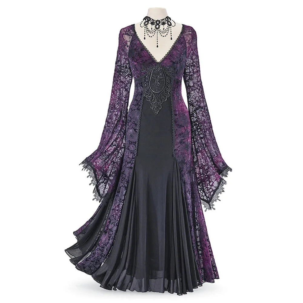 Rosetic Women Dress Lace Patchwork Chiffon Printing V neck Retro Temperament Slim Women Vintage Dress Gown Medieva Retro Dresses