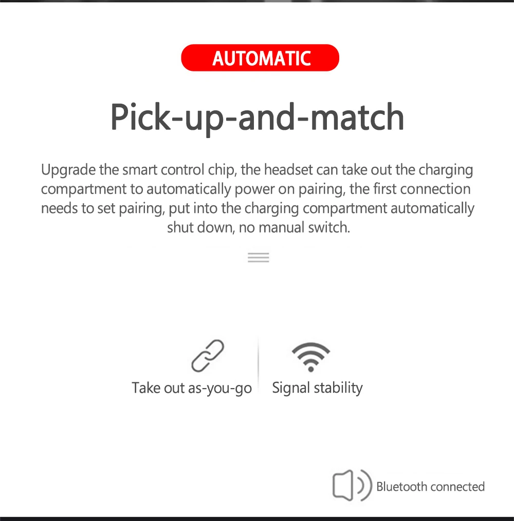 Power-on is automatically paired. Upgrade the smart control chip, the headset takes out the charging compartment, turns on the automatic pairing, the first connection needs to set the pairing, put into the charging compartment automatic ally shutdown, no manual switch