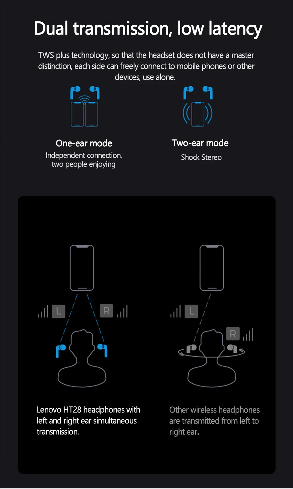 TWS PLUS technology allows the headset to no longer have a primary and secondary point, with mobile phones or other devices freely connected on each side and used alone
