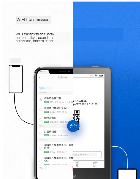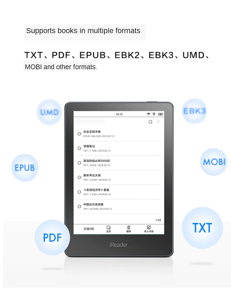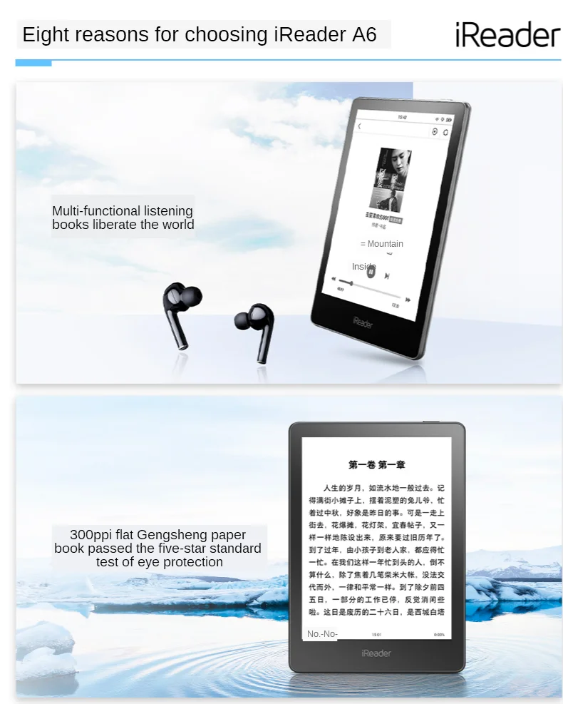 Product name: iReader A6 Brand: iReaderMemory Capacity: 8GB Resolution: 1448X1072300PPI Touch screen: touch screen Screen size: 6in.Backlight display: yesScreen type: E-ink screen Reading Light: YesAI sound support language: English / Chinese