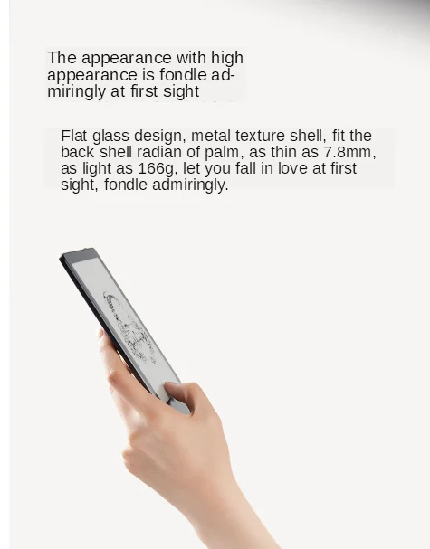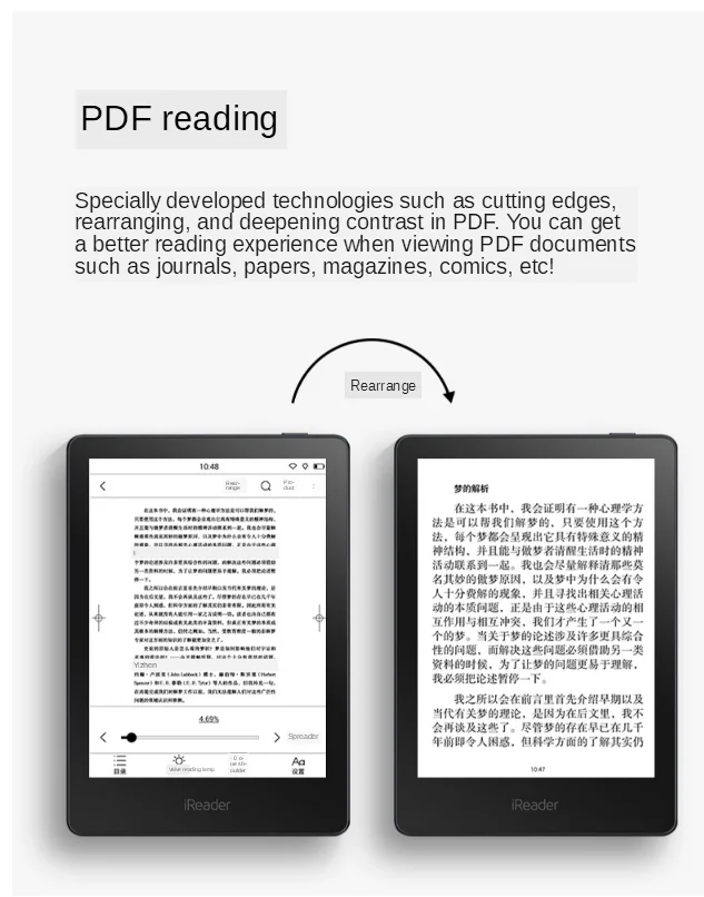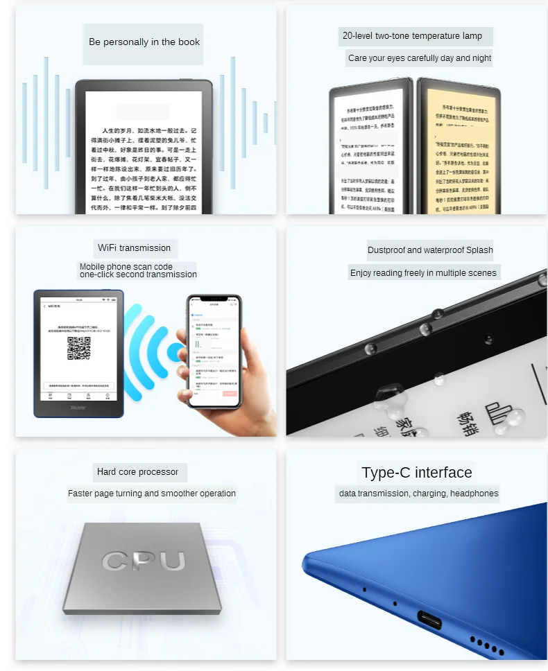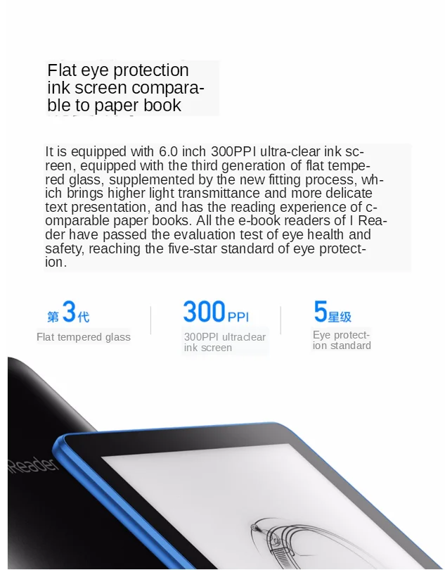 With a 6.0 inch 300PPI super clear ink screen, a third generation flat screen, toughened glass, and a new laminating process, it offers higher light transmittance and finer text presentation, making it a comparable reading experience. I Reader has passed the eye health and safety assessment and assessment tests to reach the five-star standard for eye protection.