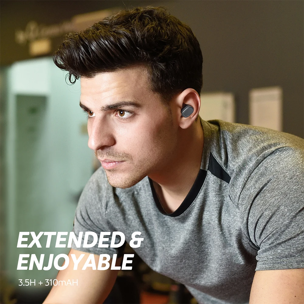 Bluetooth 5.0 provides low-power consumption and low-latency, you will enjoy 15 hours playtime with 380 mah re-chargeable Case(3-4 times) for whole day usage. Feeling no burden to carry the mini size charging case with you.