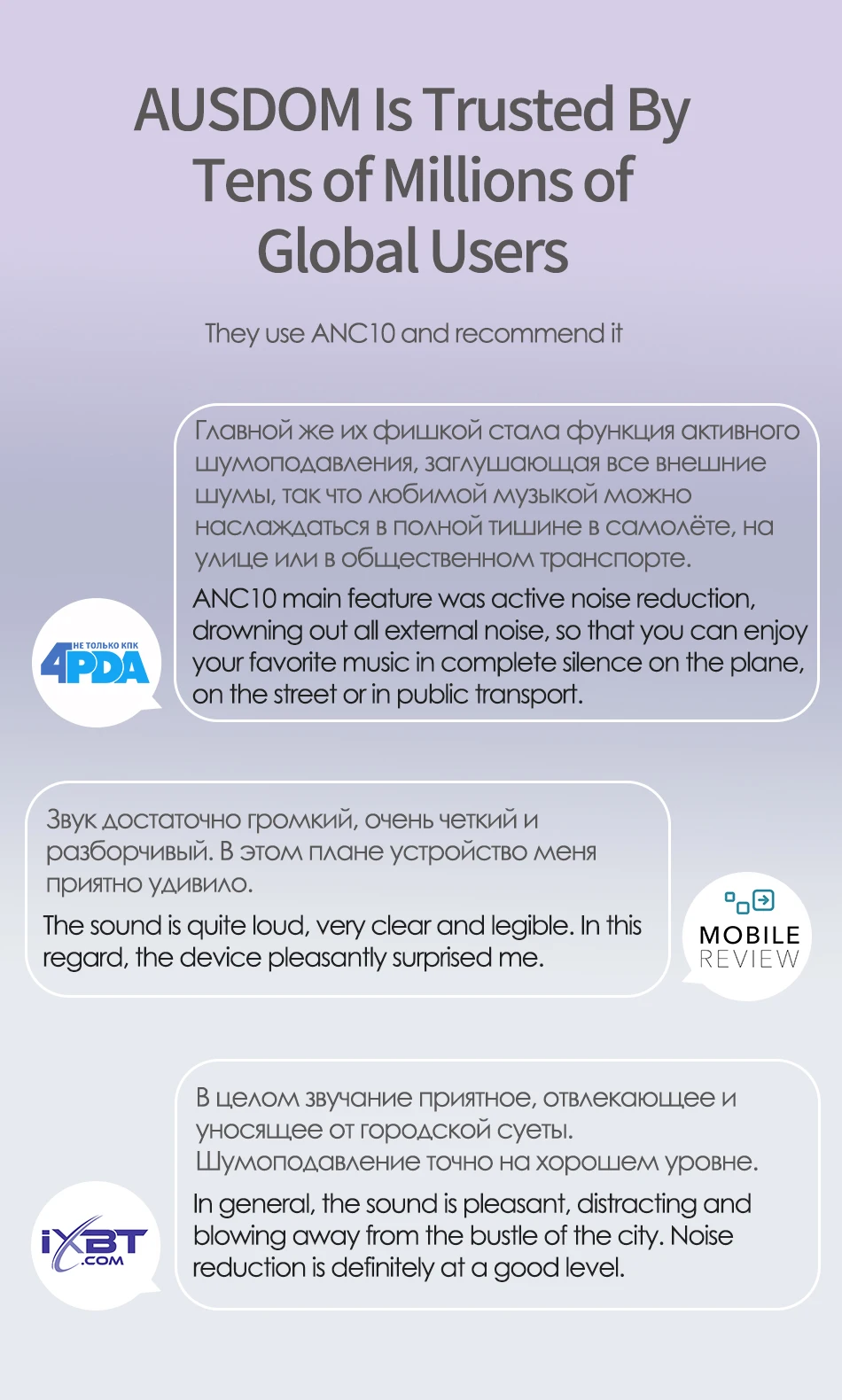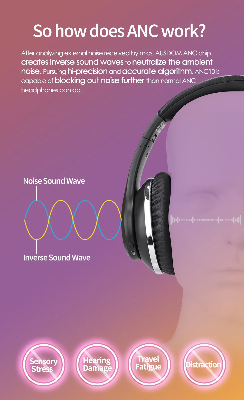 After analyzing external noise received by mics, AUSDOM ANC chip creates inverse sound waves to neutralize the ambient noise. Pursuing hi-precision and accurate algorithm, ANC10 is capable of blocking out noise further than normal ANC headphones can do.