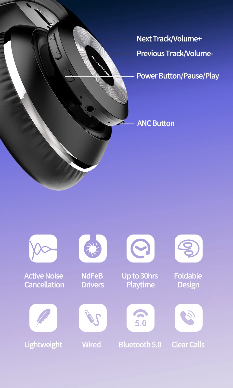 Ausdom ANC10 Active Noise Cancelling Bluetooth Wireless Headphones Foldable 30H Play time Hifi Deep Bass Bluetooth Headset