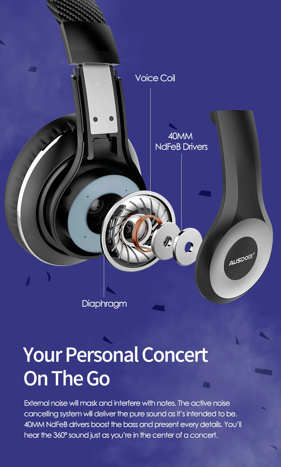 Ausdom ANC7S Active Noise Cancelling Bluetooth Headphone HiFi Stereo Deep Bass Wireless Headset for TV Computer Phone