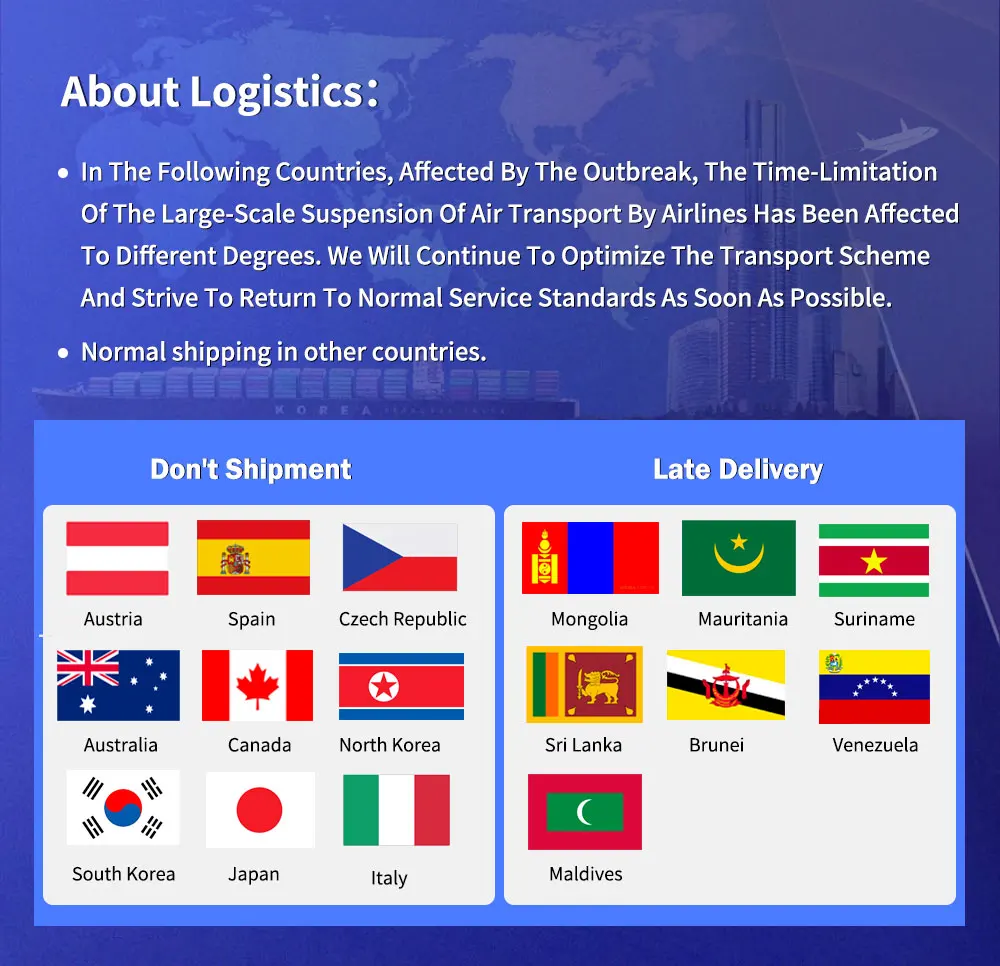 Dear friend, we received the message. The following eight countries (Mongolia, North Korea, Mauritania, Suriname, Sri Lanka, Brunei, Venezuela, Maldives) have recently been affected, and the timeliness of large-scale suspension of airlines has been affected to varying degrees. We will also continue to optimize the transportation plan and strive for recovery as soon as possible To the normal service standards, In addition, Austria, Spain, Italy,Czech Republic, Australia, Canada, North Korea, South Korea, Japan and other eight countries affected airlines have suspended their shipments. We will cancel shipments in these eight countries