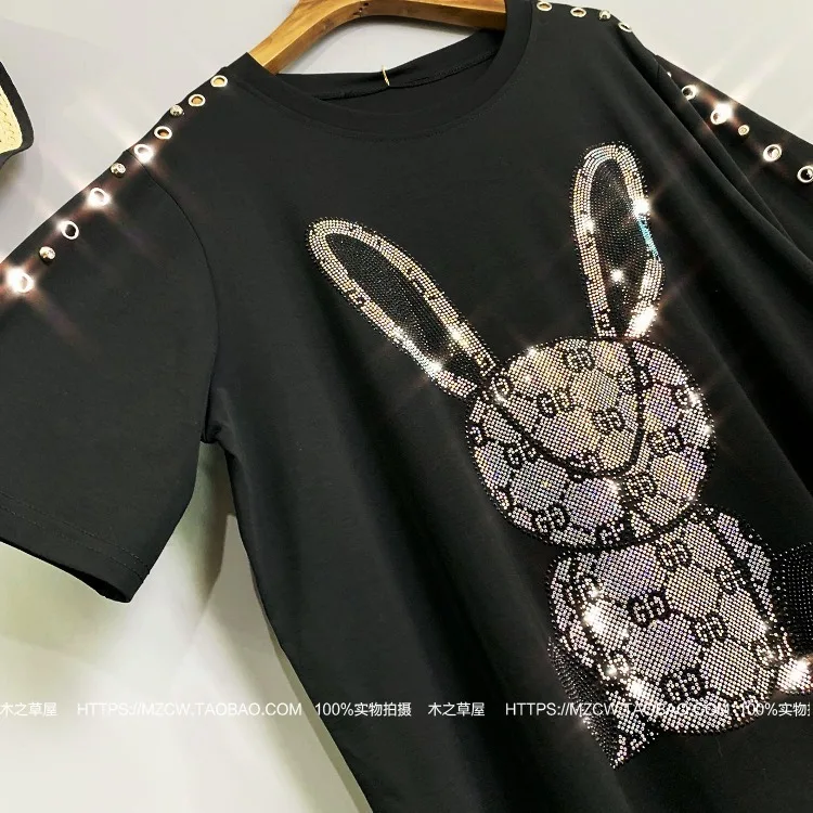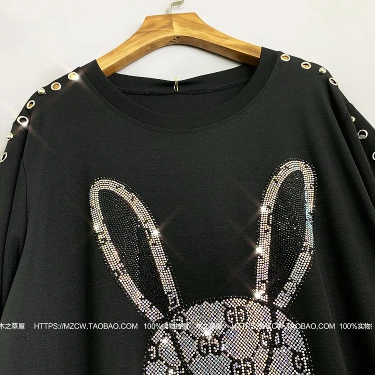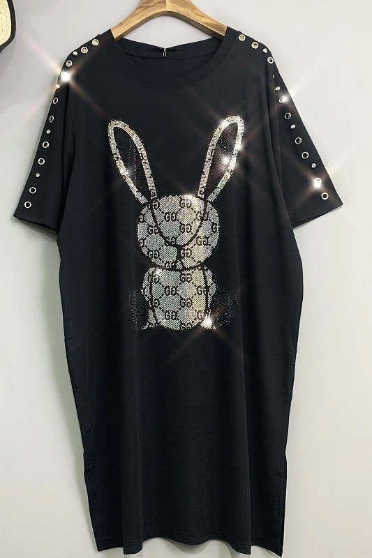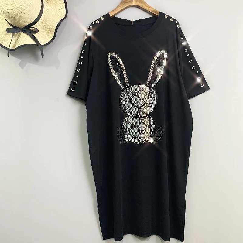 2020 Women Animal Rabbit Print Dress Rhinestone Pattern Women Metal Rings Decorate T Shirt Dress Women Summer Dress Hat ZQY1069