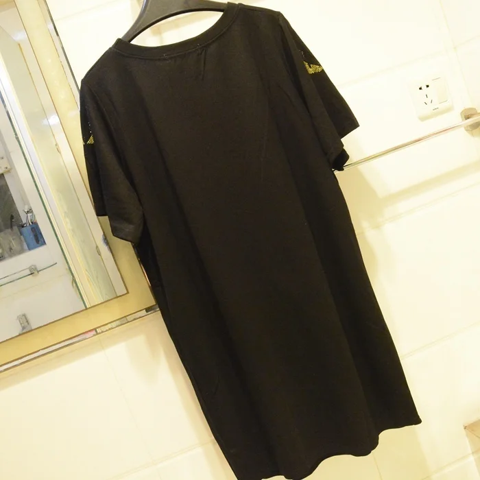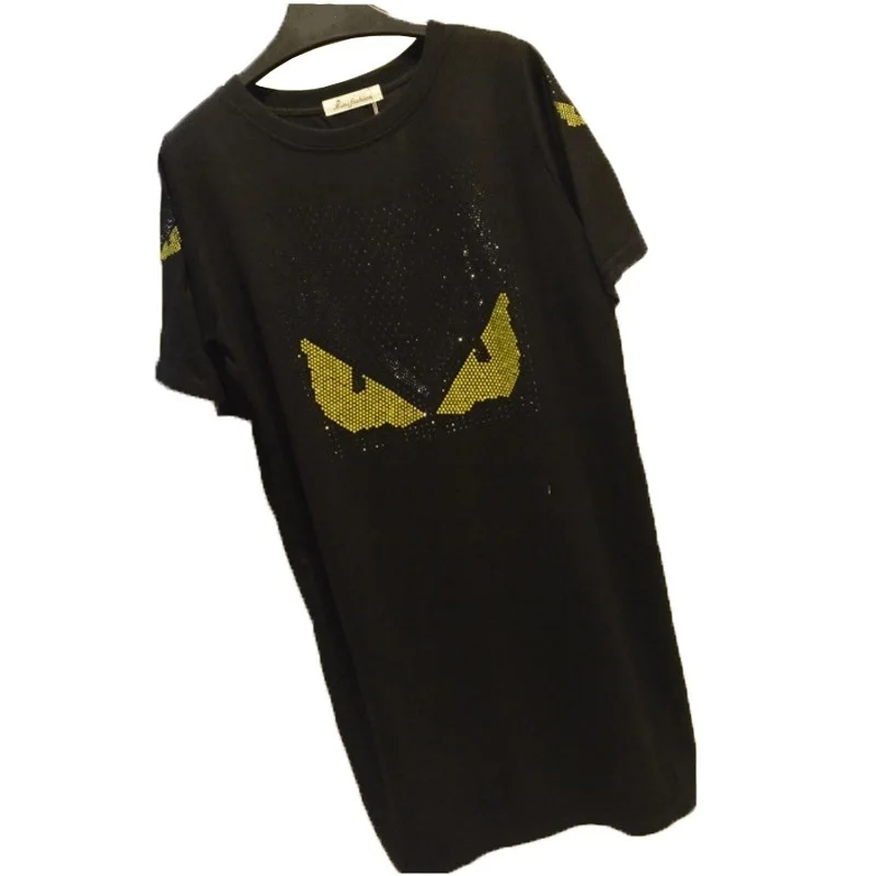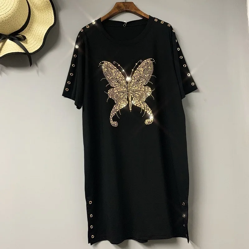 QING MO Women Butterfly Print T Shirt Dress With Rhinestone Women Black Casual Loose Dress Women Summer Fork Dress ZQY1070
