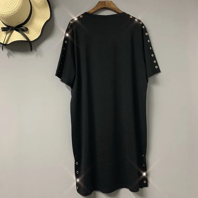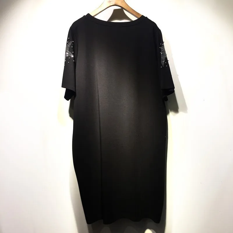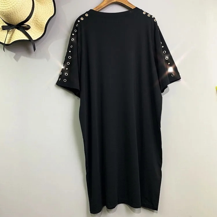 QING MO MO Plus Size Women Summer Dress 2019 with Rhinestone Short Sleeve Black Shirt Dress Hat Pattern Loose Dress Femme QF664